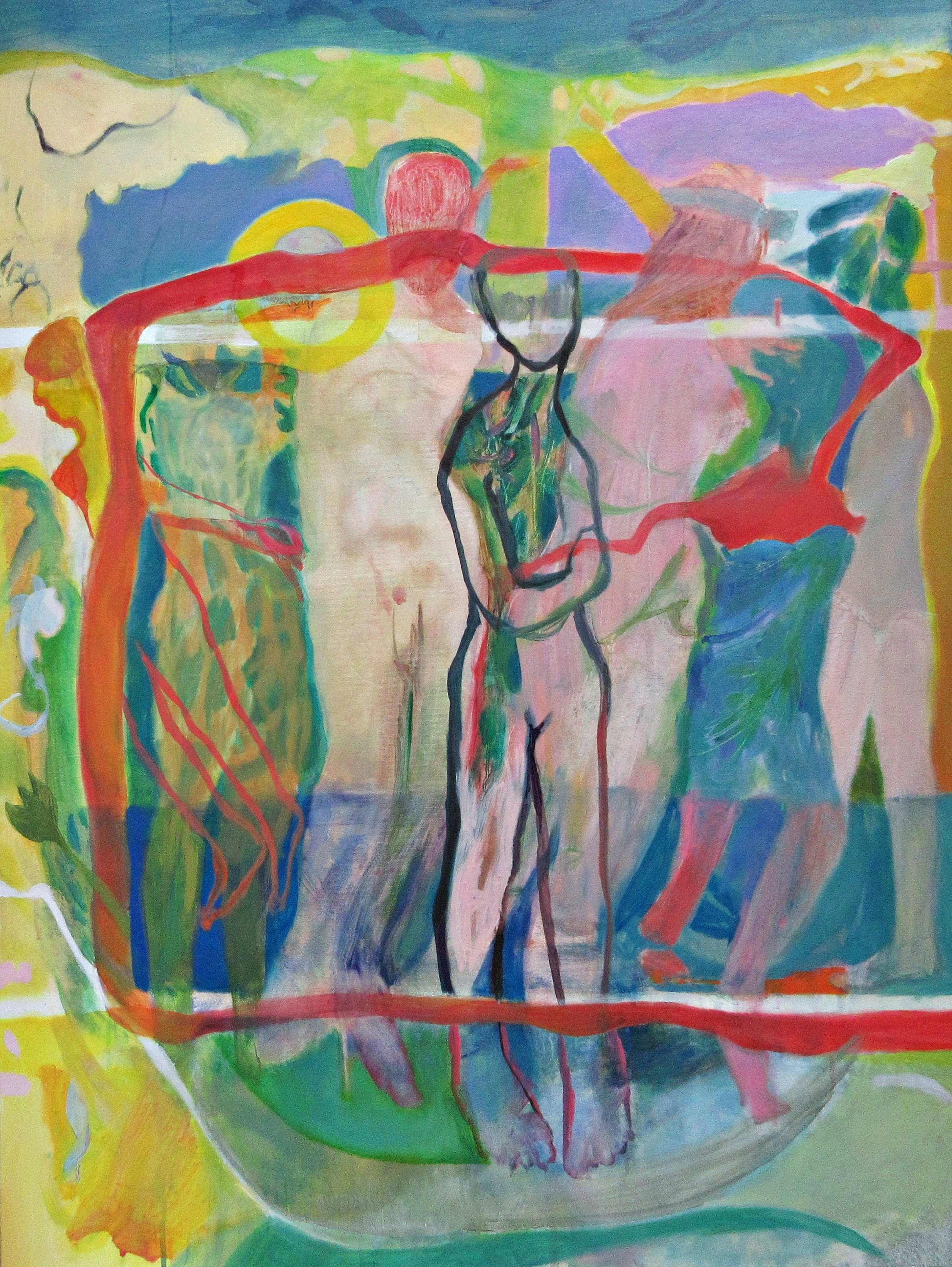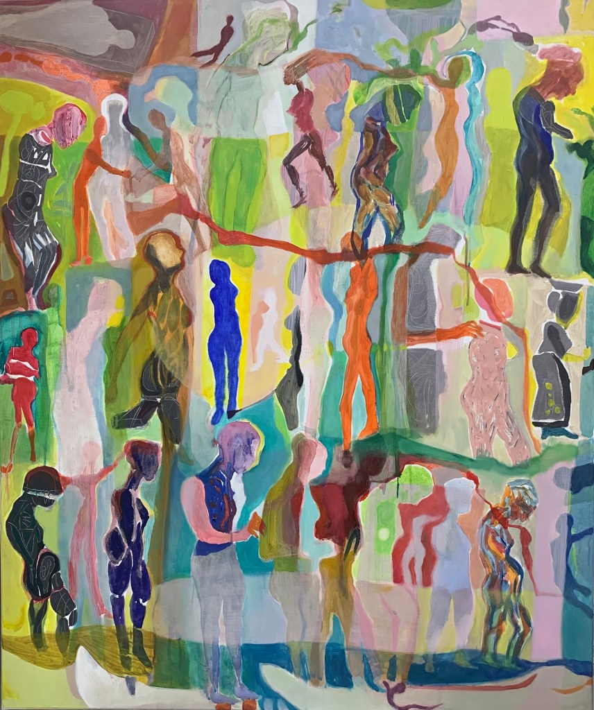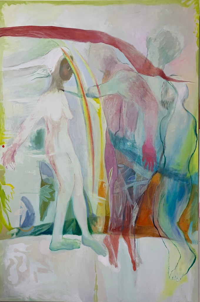 Transfiguration, 2021, oils and acrylic on canvas, 150×100 cmArtworks on canvas and paper inspired by folklore narratives. Transfiguration is a spiritual higher level of transformation. In the peoples rituals it is often connected with the natural circle of life and change of seasons. In my work I use objects like red vails and rainbows which represent spiritual change, hiding and unveiling secrets of transforming, A family portrait under a tree, 2020, oils and acrylic on canvas, 123x 98 cm.Red threads Forking Paths, 2021, oils and acrylic on linen, 120x100cm